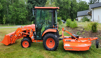 Our larger 4 cylinder, 40hp diesel compact tractor is best suited to medium to larger jobs, such as larger field mowing jobs, new driveway/RV pad construction, larger dirt/gravel jobs and larger leveling jobs. Its heated/air-conditioned cab allows for comfortable work in adverse weather. The larger bucket and field mower, combined with larger size and horsepower make for faster work.